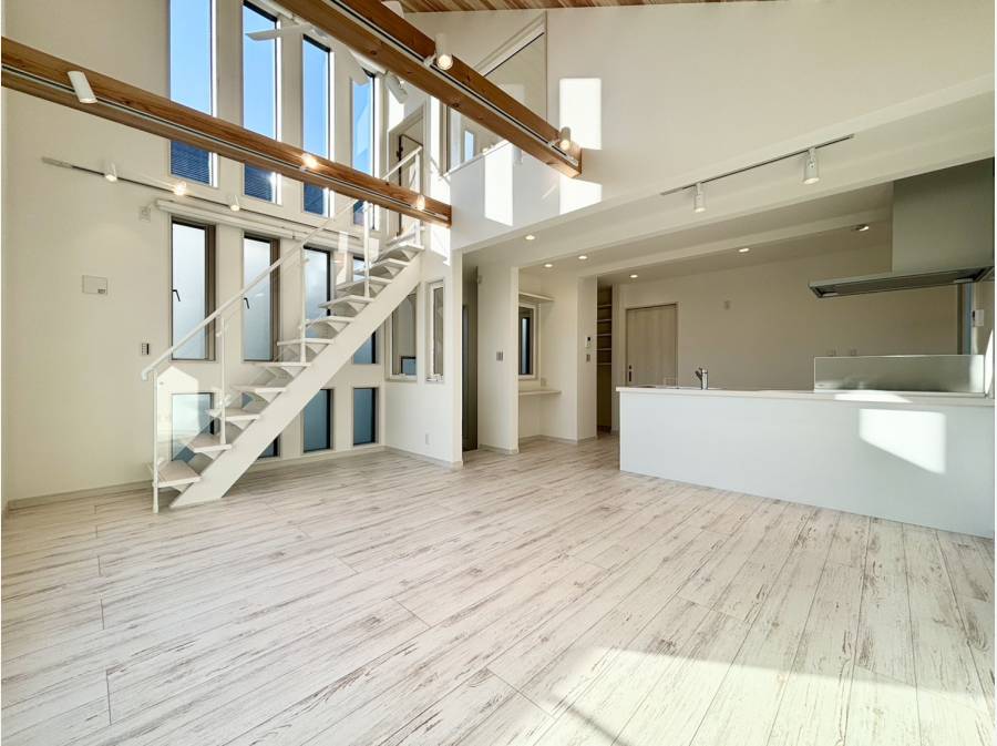 光がパッと広がる白いリビング。ロフト・造作棚・こだわり満載!”好き”が詰まった住み心地良好な住まいです。