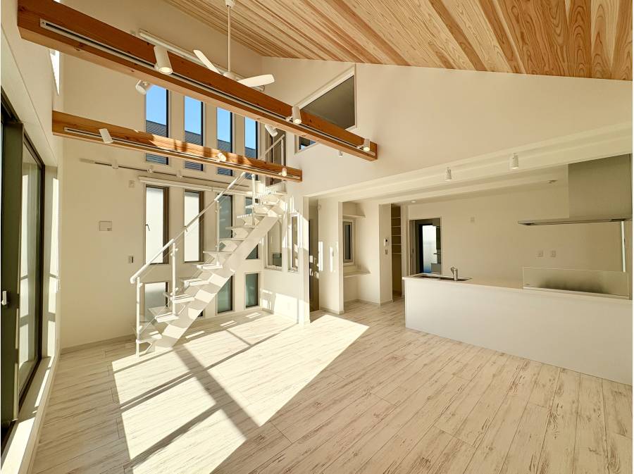 間取りは3LDK+ロフトで、18.3帖の広々としたLDKには吹き抜け勾配天井を採用。秋田杉を使用した天井が、温かみと落ち着きを感じさせる空間を作り出し、家族でのくつろぎの時間を充実させます。