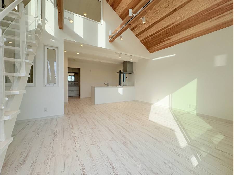 6寸勾配の天井に秋田杉を使用し、温もりある吹抜け空間となってます。