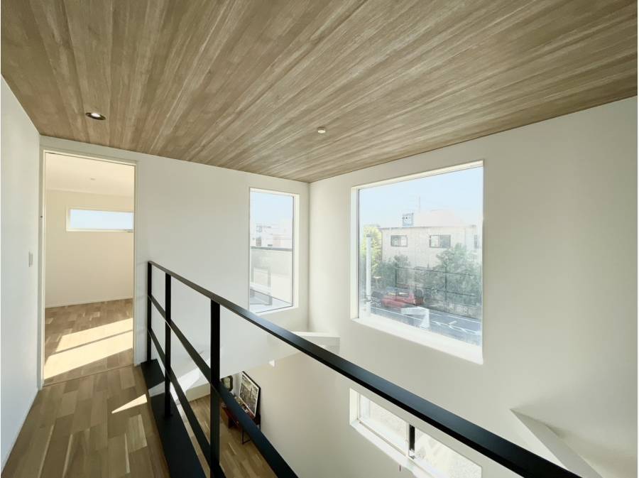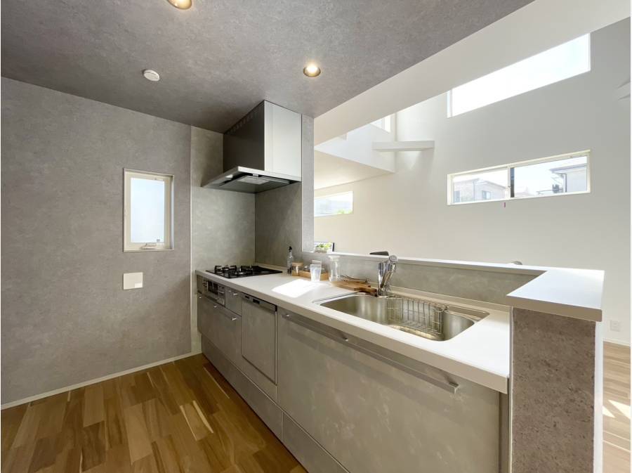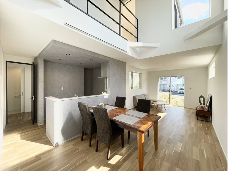 室内は、ダイニングキッチンを吹抜けにすることで抜群の開放感と明るさを実現。家族の会話を育むアイランドキッチンを採用しています。また、水回りを2階に集約し家事動線を短縮するなど、日々の暮らしやすさにも配慮。リビングには床暖房を完備し、玄関には直接出入りできる洋室を設けるなど、デザイン性と機能性を両立させた一邸です。
