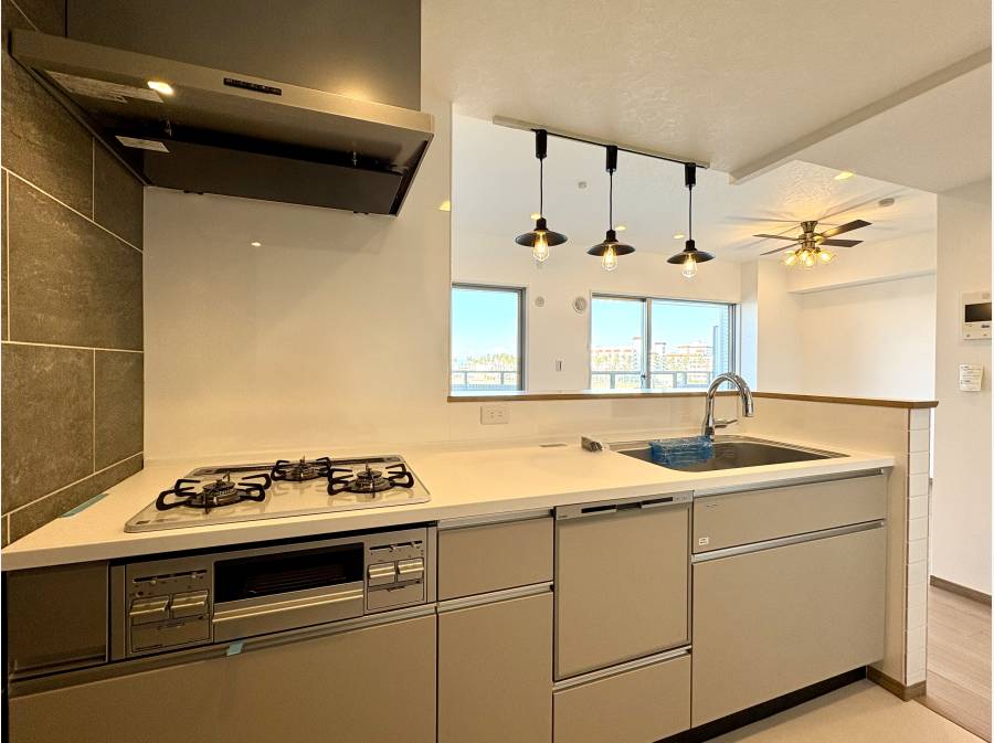 食器洗浄乾燥機や浄水器付タッチレス水栓を備えたシステムキッチン、造作の洗面化粧台、さらには空間のアクセントとなる室内窓の新設など、意匠性と機能性を両立させました。