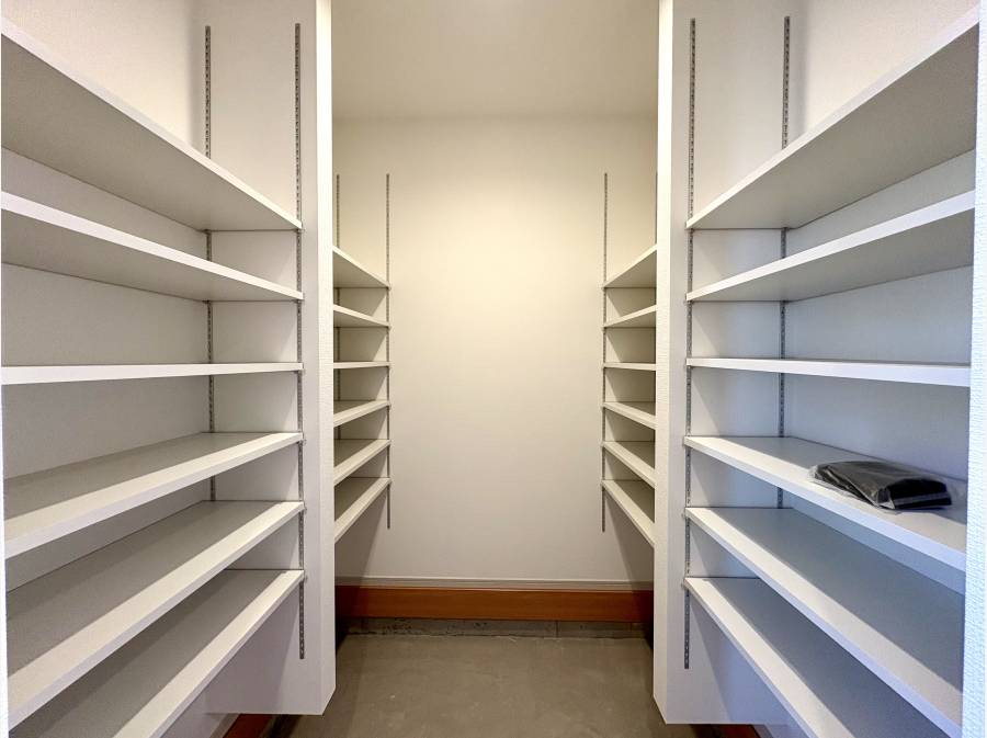 キッチン横には可動棚付きのパントリーを備え、機能性にも配慮されています。
