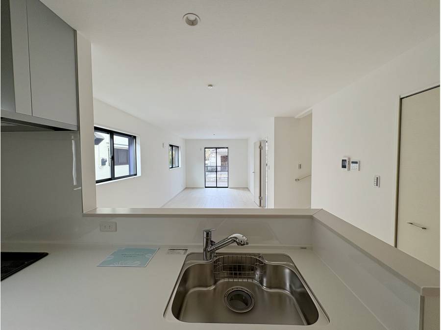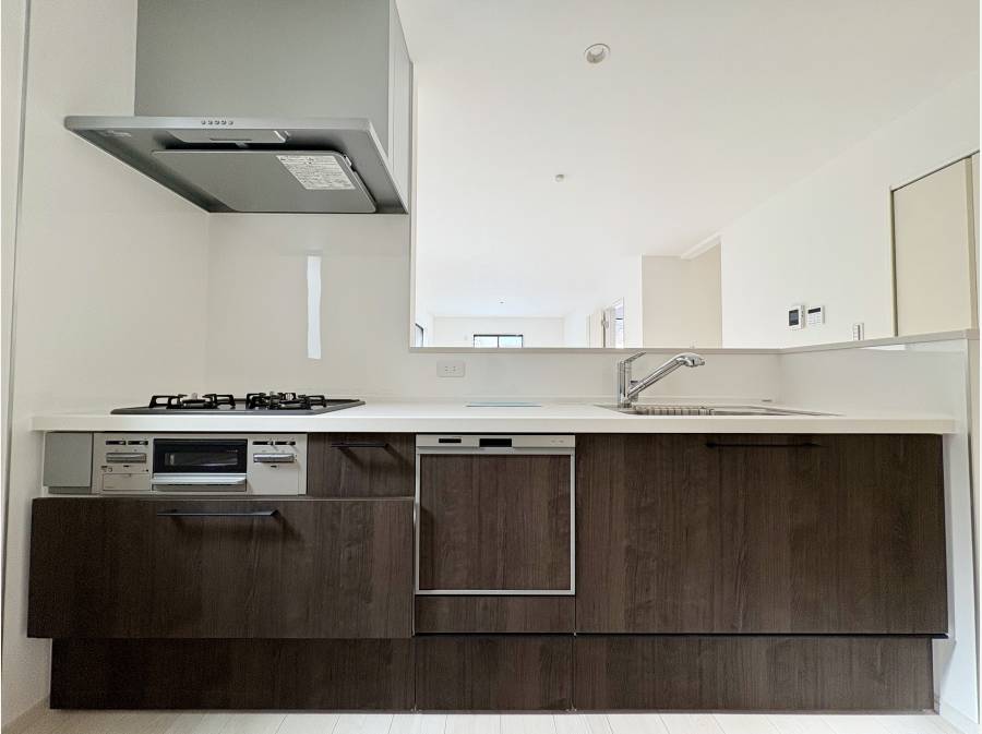 キッチンは対面式のシステムキッチン。食洗機付きで家事の手間を減らしてくれます。さらにパントリー付きで食材や食器を収納できるスペースを完備しています。