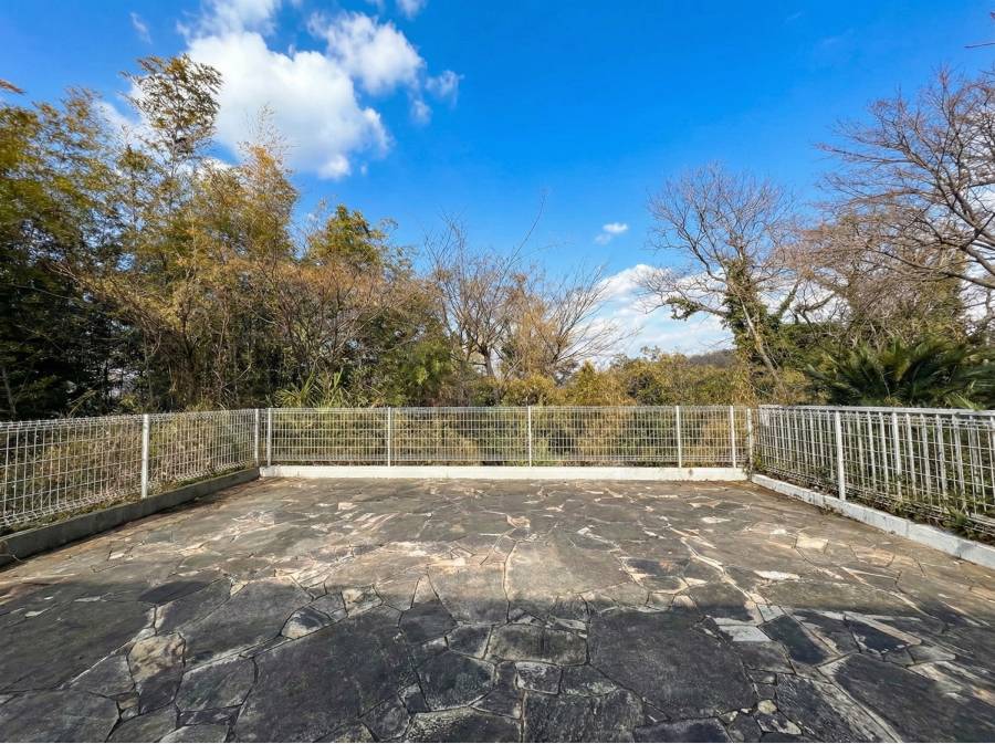 玄関前の庭に加えて、建物裏手には広々としたテラススペースも。