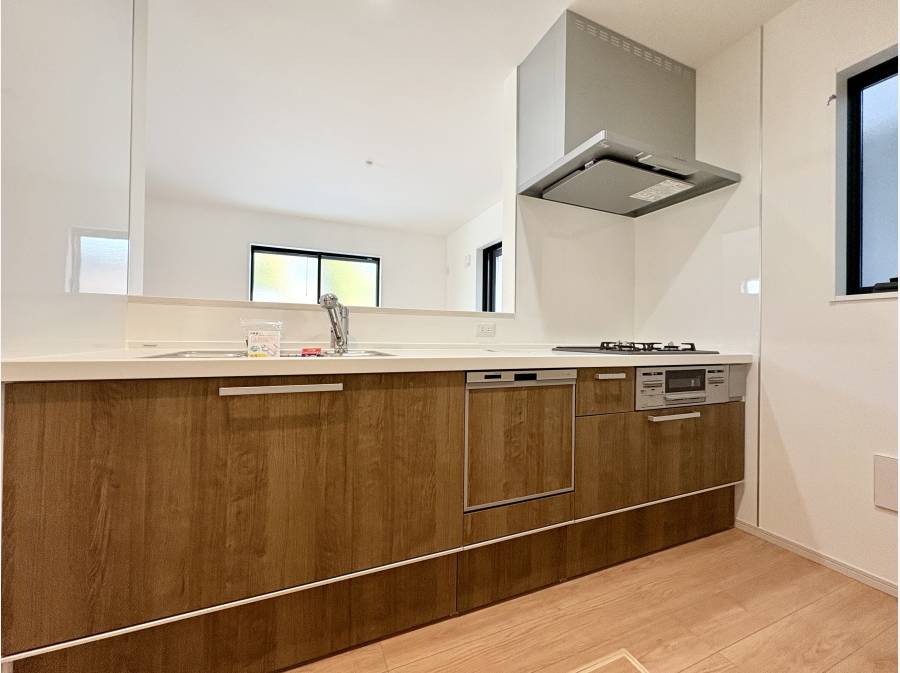 対面式のシステムキッチンにパントリーも備えられ調理のモチベーションが上がるキッチンスペースです。