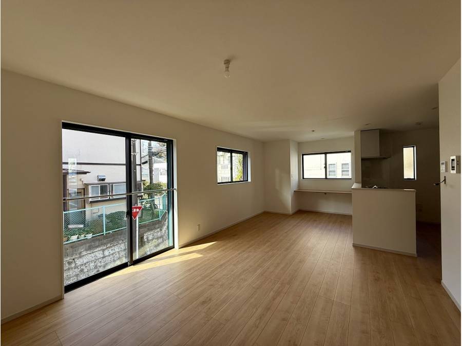 高台の立地から室内は開放的な眺望が楽しめ、間取りは4LDKで約19.1畳の広々としたLDKが庭と繋がります。