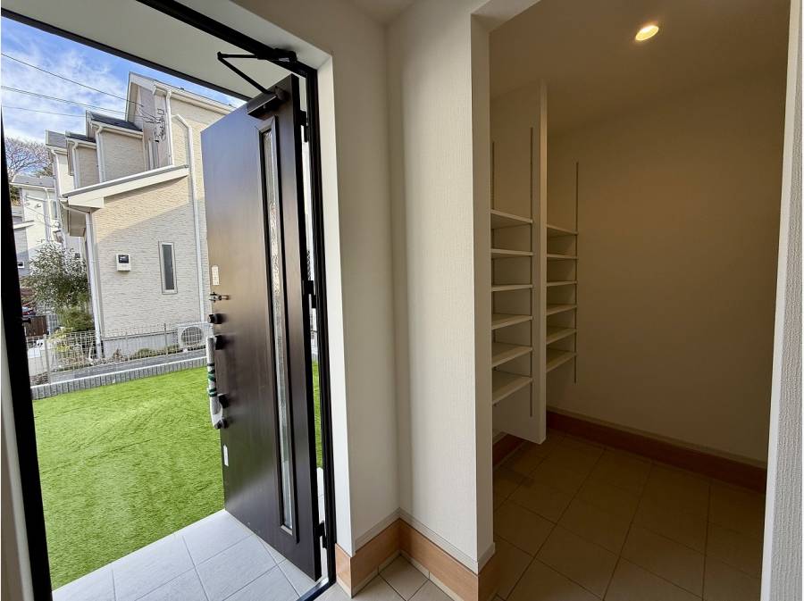 キッチン横のパントリーや玄関横のシューズクロークなど、収納も豊富です。2階の居室には建物幅いっぱいのバルコニーが付いています。