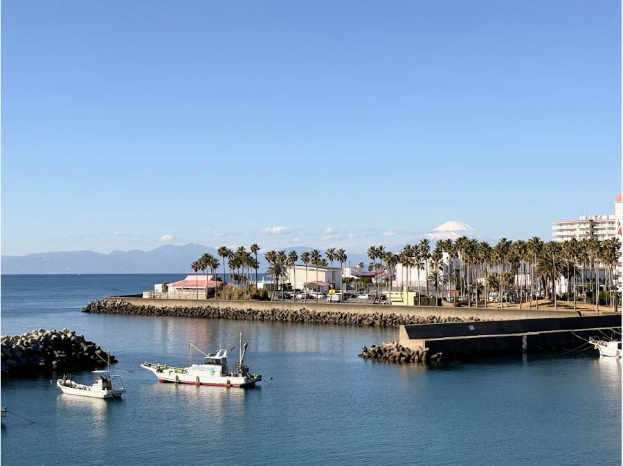 窓の向こうには、江ノ島、そして雄大な富士山を望む景色が広がります。