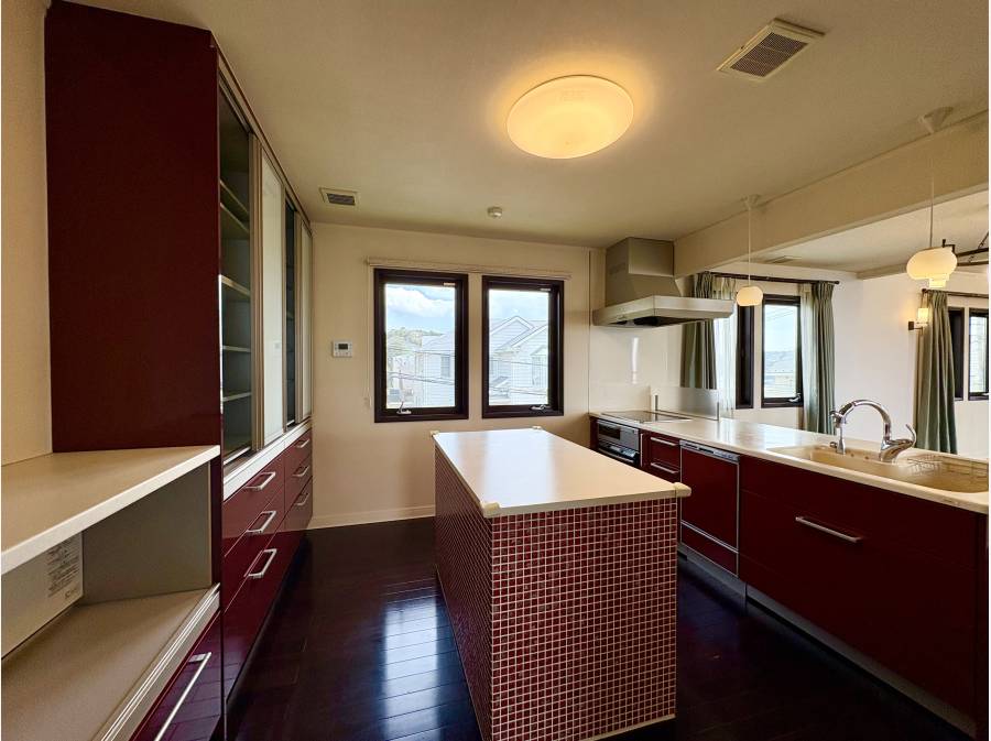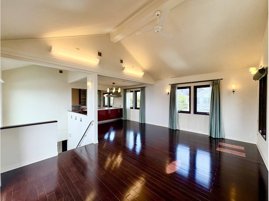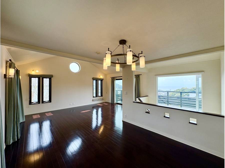 約102坪の広い敷地に建つのは、三井ホーム施工の長期優良住宅。約30帖の明るいLDKには、大きな窓越しに海と緑を望む景色が広がり、家族や仲間、ペットと過ごす時間を温かく包み込みます。